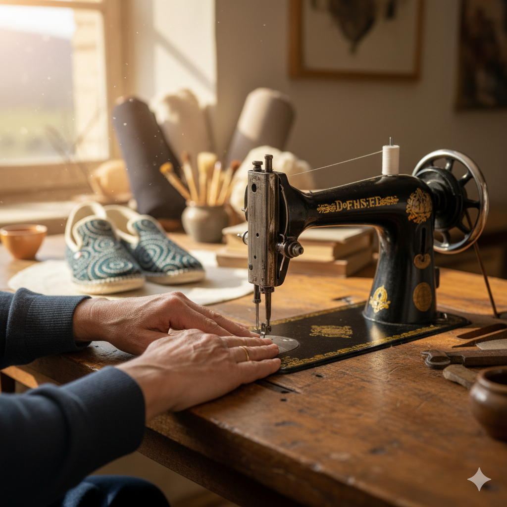 Chaque paire de charentaises Cousus est le fruit d’un travail minutieux, où chaque étape compte : la sélection des tissus, le contrecollage de la laine, la découpe, la couture, l’assemblage final et la pose de l’écusson. Rien n’est laissé au hasard. Derrière chaque modèle, il y a des artisans passionnés, des machines centenaires et une exigence de qualité que seule la main de l’homme peut garantir.