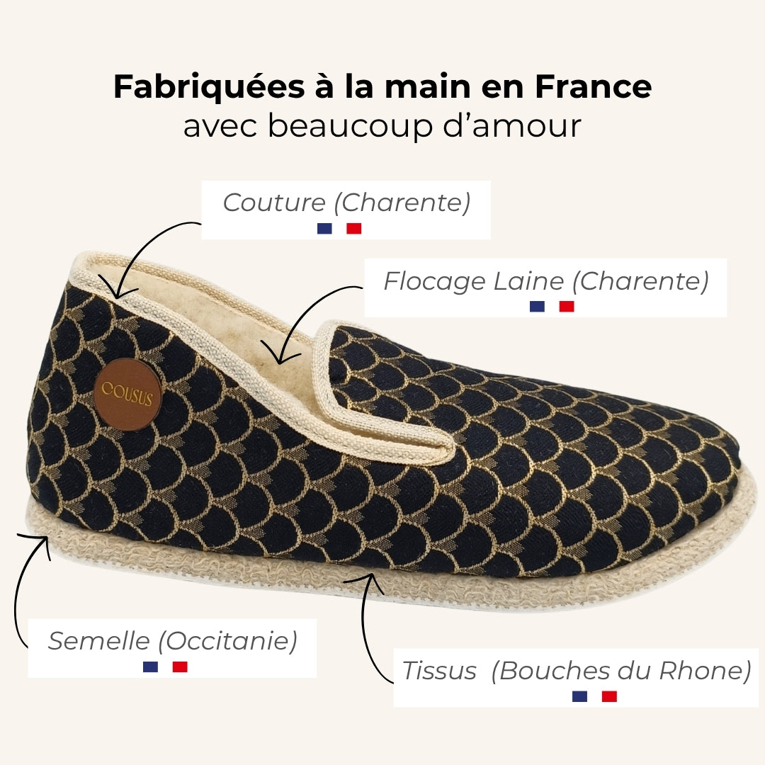 Entre design graphique et tradition charentaise, ce chausson devient une pièce élégante de votre quotidien cocooning, parfaite à offrir ou à s’offrir.