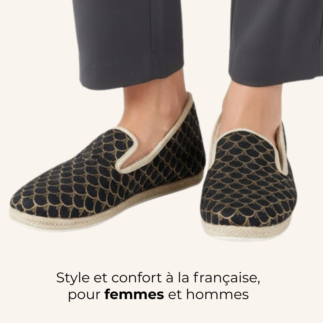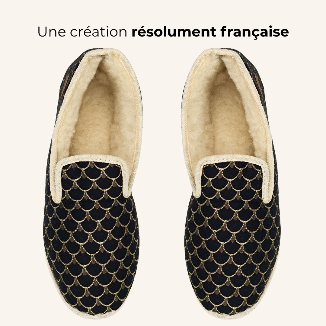 Découvrez l’élégance sobre et raffinée des Charentaises Écailles Impériales 🇫🇷, inspirées des textures précieuses et des motifs asiatiques traditionnels.
