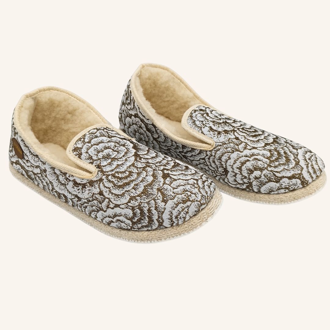Les modèles floraux et dorés apportent une touche de poésie et de féminité. Ils rappellent les tissus d’antan, mais dans une interprétation contemporaine, lumineuse et légère. C’est une pantoufle qui s’assume, qui a du style, et qui redéfinit le confort au féminin : raffiné, discret et profondément élégant.